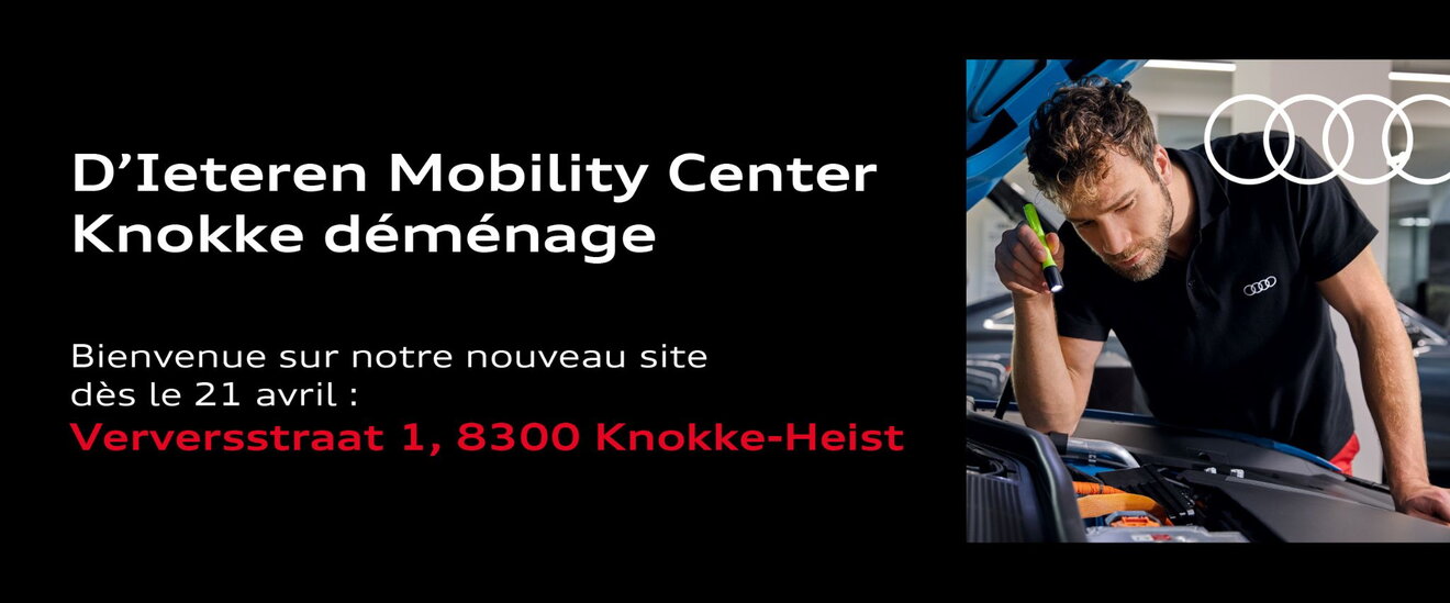 Pour l’entretien, les réparations et les conseils techniques, ainsi que pour les véhicules d’occasion premium Audi Approved :plus, nous serons ravis de vous accueillir au D’Ieteren Mobility Center, Verversstraat 1, 8300 Knokke-Heist.